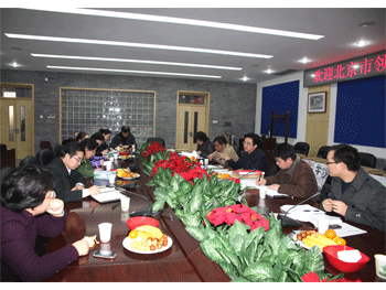 会议现场 王殿军校长(正面左1)向视导团领导们做汇报