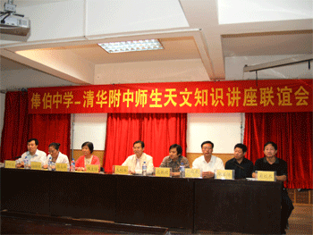 9月27日晚,清华附中天文协会全体同学在校长王殿军、副校长刘俊等的带领下前往清华附中的“手拉手”学校——顺义区俸伯中学,与那里的师生一起进行“清华附中—俸伯中学天文科普中秋赏月联谊活动”。此活动是“迎奥运、度佳节、创和谐”海淀区第二届中秋赏月天文系列活动中的一个组成部分。北京天文馆、海淀区青少年活动中心、顺义区教委、镇政府、俸伯中学等有关领导也出席了此次活动。