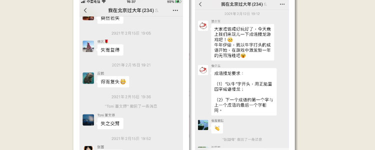 教职工们参照工会干部提供的北京过年的习俗,同时结合自己家乡过年的习俗,纷纷在“我在北京过大年”的微信群中展示各自丰富多彩的过年方式,开展具有年味儿的居家活动,营造出浓浓的过大年氛围。