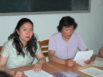 陈红老师主持党员发展大会 罗春霞老师(右)介绍对向丽老师的组织考察情况