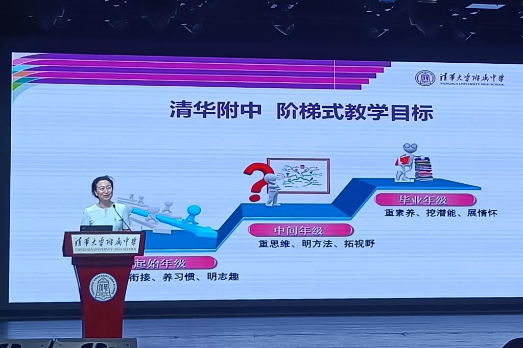 随后,张苏主任发言。张苏主任向家长介绍了课程设置,清华附中在开设国家规定的课程之外,还开设了课后服务课程,课程内容丰富多彩。此外,清华附中还设立了严格的课程实施制度,包括校本教研制度、专题教学活动和教学过程监测,保证学校教育工作的有效进行。会中,张苏主任阐述了清华附中阶梯式教学目标,初一年级的整体教育教学目标为“重衔接、养志趣、明习惯”,以培养学生自主学习能力和创新精神为目标,开设“少”“精”“严”“活”的特色课堂。