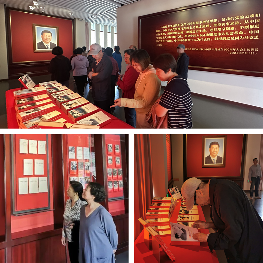 在“真理之光”主题展,离退休教师们驻足在习总书记的著作展台、近距离观看各类专题文集、仔细翻阅习总书记的著作
