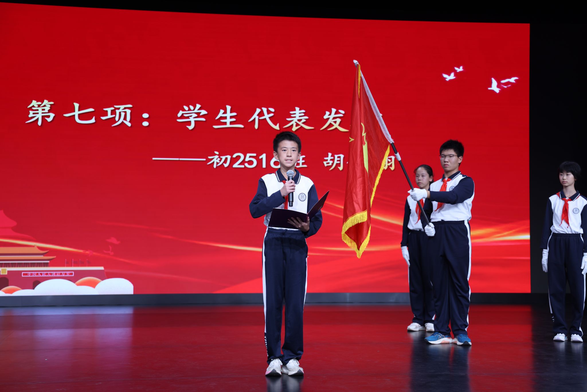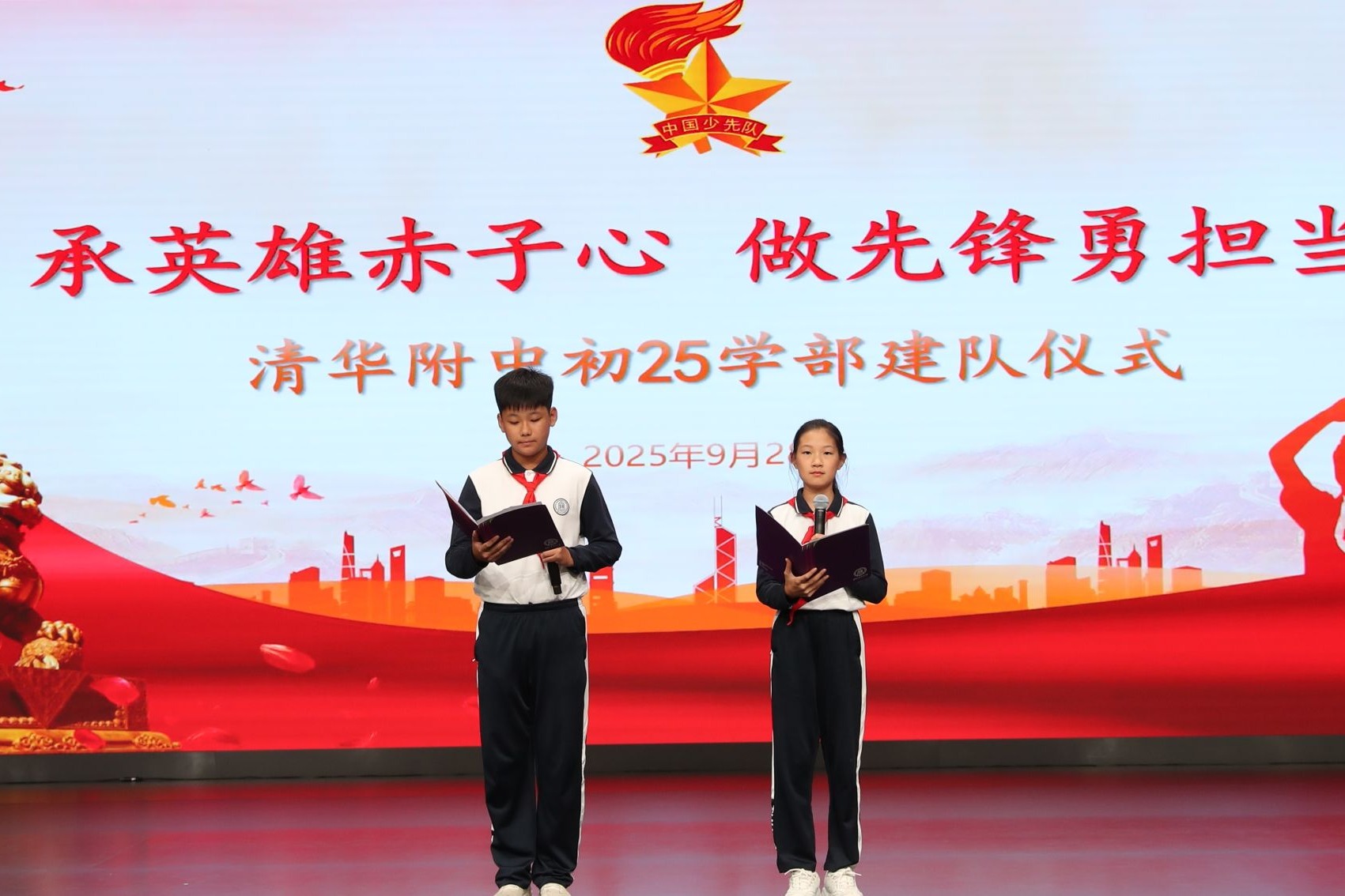 仪式上,学生发展中心副主任李冰清宣读初25学部建队决定。在热烈的掌声中,清华附中副校长张苏与初25学部主任那妮老师为各中队授中队旗,接过队旗的中队长们昂首挺立,肩负起引领中队成长的责任。初2516班胡钊翔作为少先队员代表上台发言,他分享了对加入少先队的憧憬与期待,表达了传承国防精神、勇担少年使命的坚定信念。