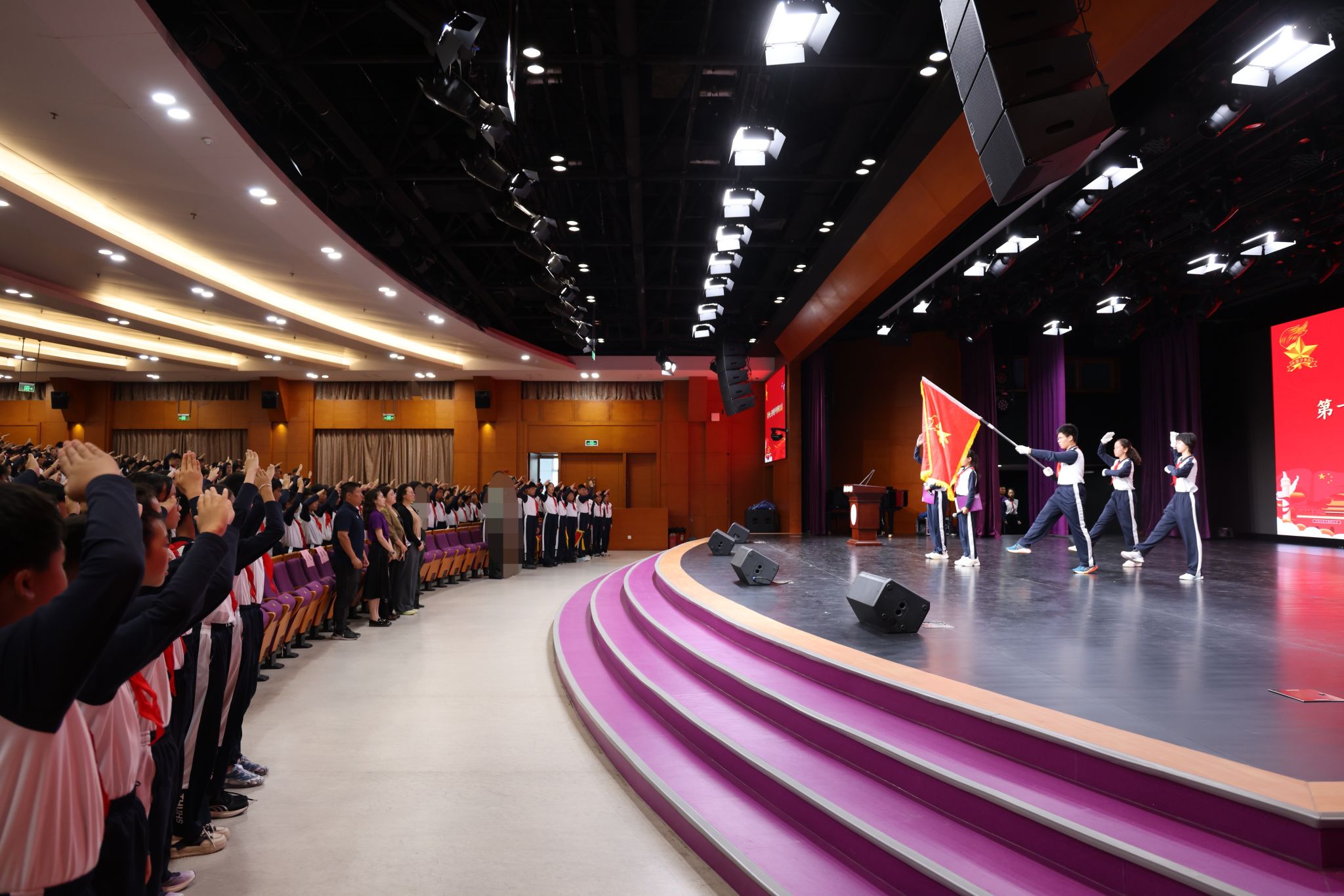 最后,在《退队旗曲》中,全体少先队员敬礼目送队旗退场。主持人带领全体师生重温初心使命,号召大家以少年之蓬勃赴时代之邀约,为实现中华民族伟大复兴的中国梦努力奋斗。