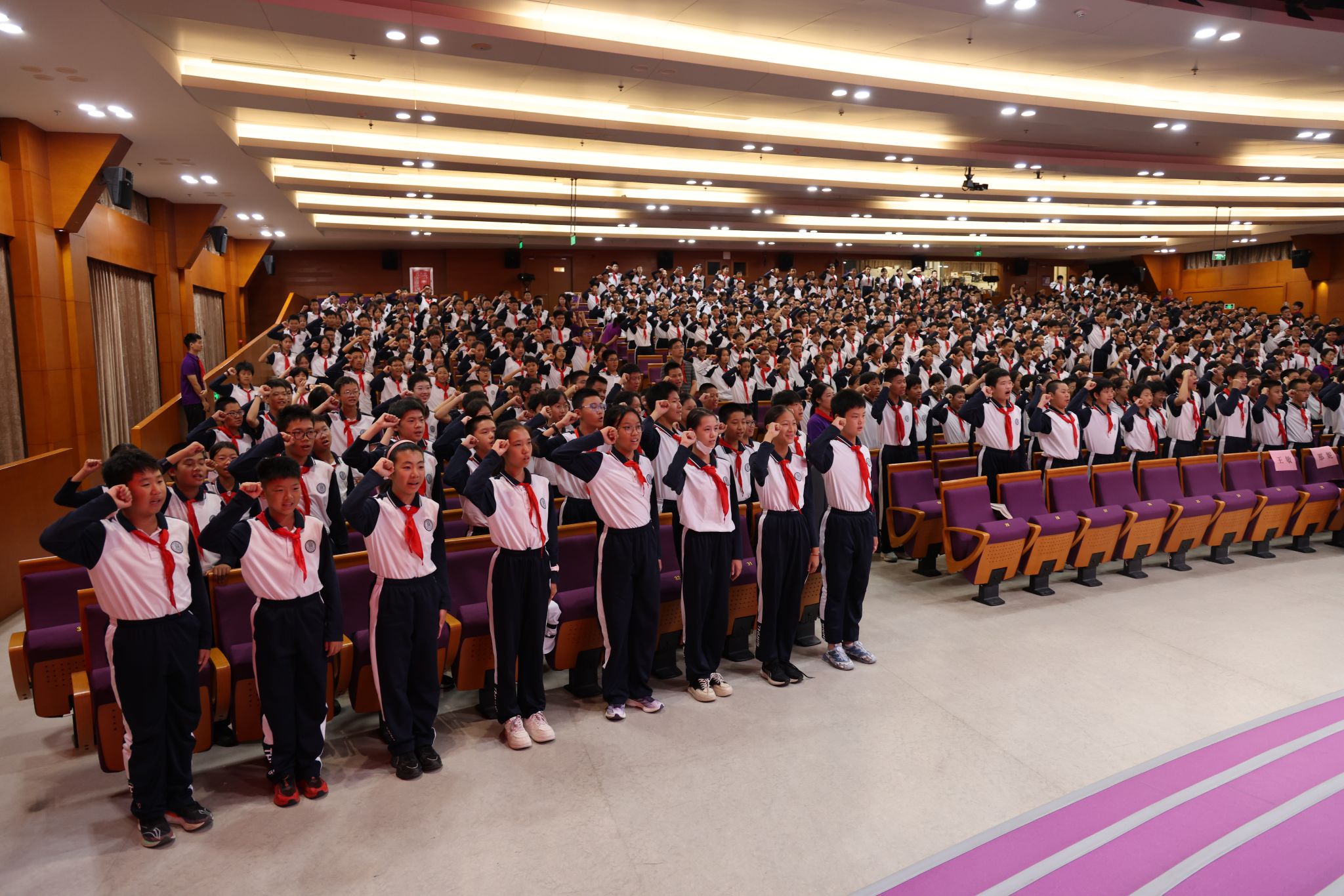 为感恩师长引领,组织委员们为各中队辅导员佩戴红领巾,鲜红的领巾在师生间架起责任与传承的桥梁。随后,全体少先队员面向队旗,举起右拳庄严宣誓,铿锵的誓言回荡在校园中,成为少年们对信仰的郑重承诺。仪式中,学部还对入学教育阶段表现突出的班级进行表彰,初25学部副主任王敏与刘志杰老师为荣获“规范认知之星”的班级代表颁奖,激励全体同学严守校规校纪,筑牢成长根基。