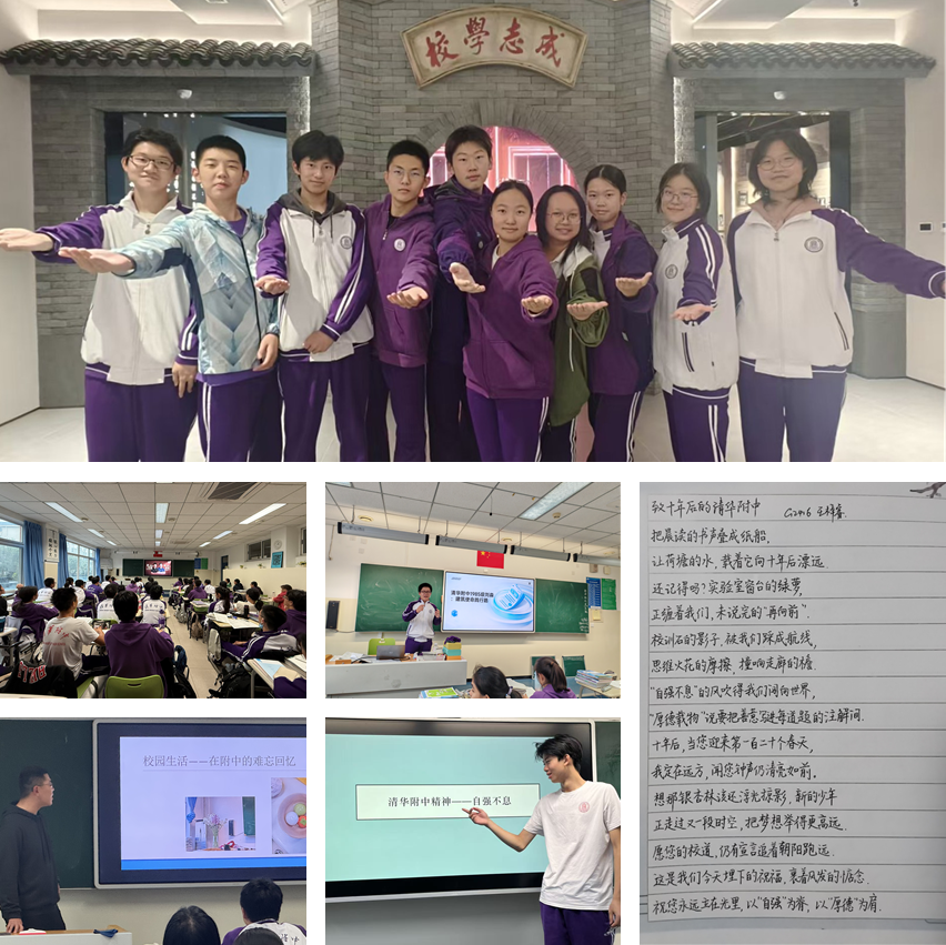 欢迎同学们走进清华附中校史馆、高2407班同学集体观看《附中校友说》、高2416班同学分享校友访谈感想、高2416班王梓睿硬笔书法作品——《致十年后的附中》、学长走进高2418班讲述自己的附中故事、高2404班同学讲述传承中的附中精神