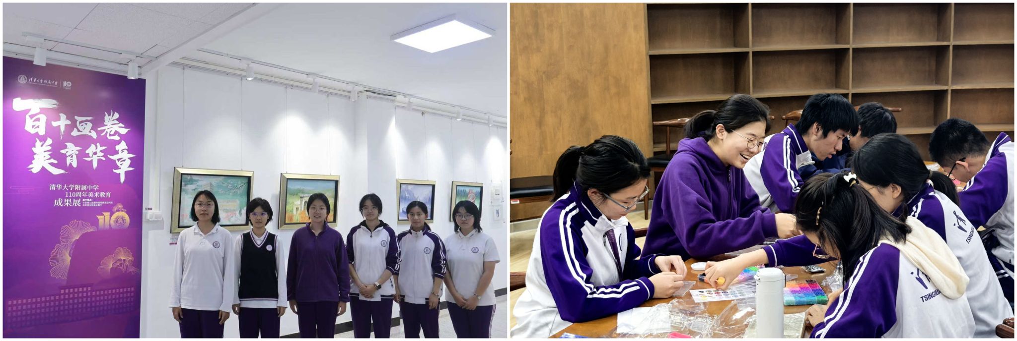 高2402班同学在自己创作的壁画前合影、高2410班同学共同动手制作建校110周年礼物