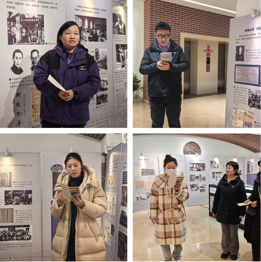 为让党员更深刻感悟历史内涵、读懂展品背后的精神密码,党支部特别邀请了焦义菊老师、张嘉宇老师、史小川老师、吴尚老师四位党员担任讲解员。展览以时间为脉络,通过珍贵的历史照片、详实的档案文献,生动再现了抗战时期清华师生的爱国壮举与精神坚守。从九一八事变后“华北之大,已安放不得一张平静的书桌了”的振聋发聩呐喊,到全面抗战爆发后清华与北大、南开南迁昆明组建西南联大的“文化长征”;从铁皮教室、茅草屋中薪火相传的学术救国,到无数清华人奔赴战场测绘滇缅公路、翻译盟军密电、投身空中御敌的热血担当,四位讲解员结合史料背景深情解读,让每一段历史都变得鲜活可感,深深触动着在场党员的心灵。