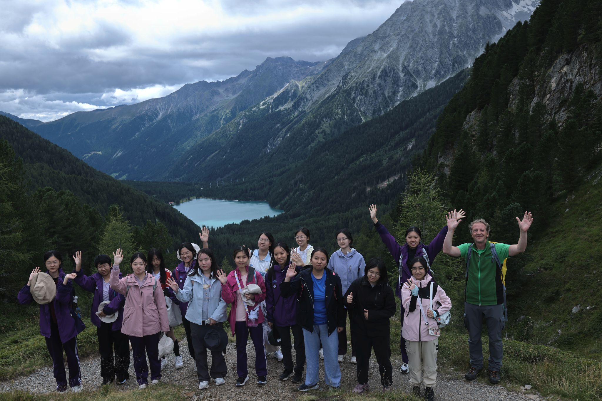 湖区徒步则多了几分惬意。湖边微风拂过,同学们沿着湖岸高山行走。路上常常碰到徒步登山的奥地利人,这其中有许多是白发老者或是带着孩子的一家人,蓝天白云、清风碧水、高山密林,奥地利人的生活已与自然融为一体。