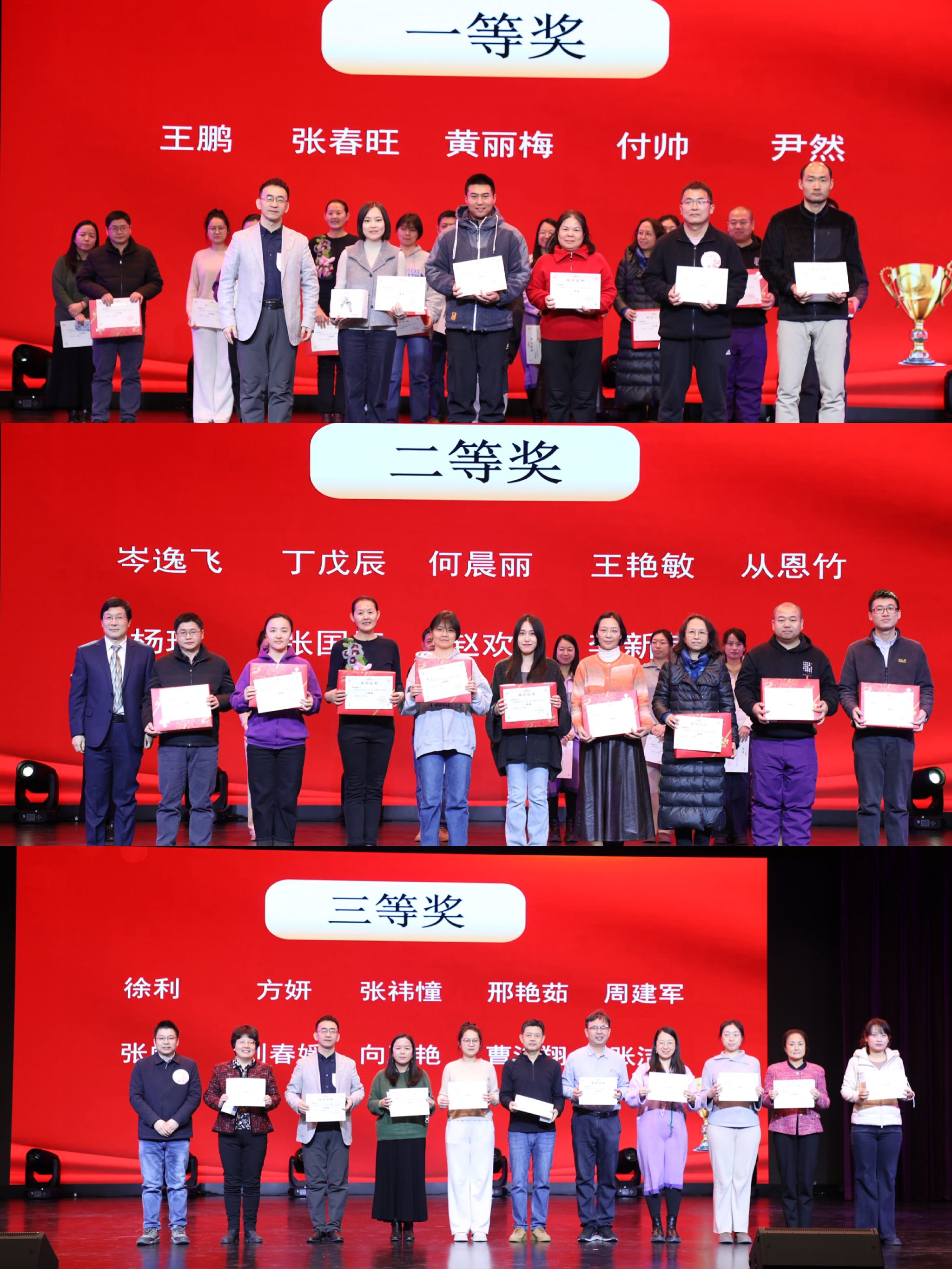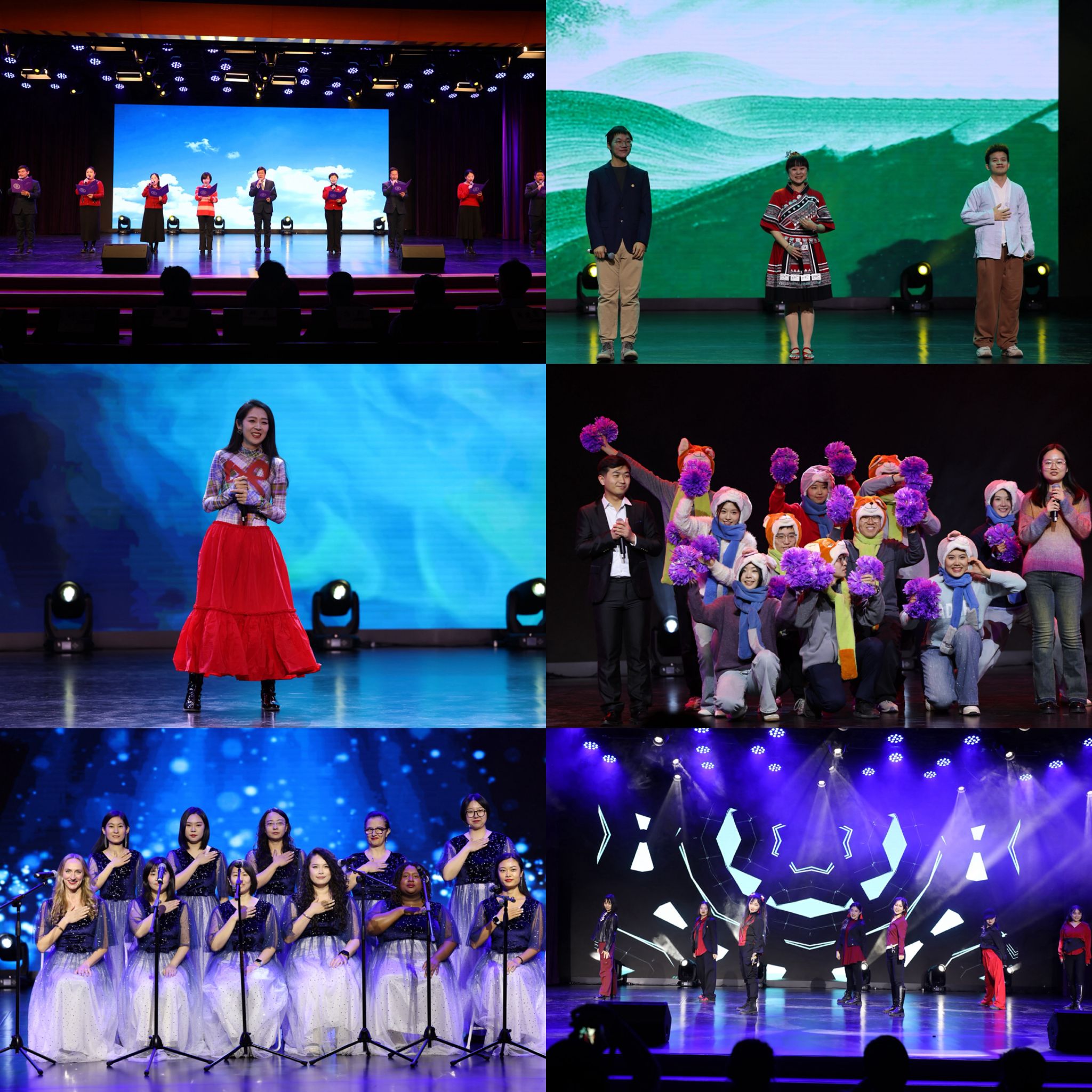文艺演出环节精彩纷呈,各部门教职工自编自导自演的节目轮番登场,尽显附中教师的多才多艺与青春风采。工会委员带来集体朗诵《我们的名字》,字字铿锵有力、情感真挚饱满,道出了“清华附中人”这个名字背后的责任与荣光,深深触动了在场每一位教职工的心灵,引发强烈共鸣;英语组刘舒畅老师倾情演唱《不醉不会》,动感的旋律、洒脱的演绎,瞬间点燃现场气氛,台下观众纷纷跟着节奏鼓掌喝彩;国际部教师团队献上合唱《白色冬日颂歌》,纯净悠扬的和声宛如冬日里的一缕暖阳,传递出温暖与希望,让人沉醉其中;闫志存、龚卉、陈昱嘉三位老师带来的歌曲联唱独具特色,从励志昂扬的《裹着心的光》到充满乡土情怀的《小背篓》,再到韵味悠长的《故湘风》,曲风巧妙切换,演唱深情动人,赢得全场阵阵掌声;新教师群体活力登场,带来歌舞表演《疯狂动物城》,可爱的造型、灵动的舞姿、创意十足的编排,充分展现了青年教师的蓬勃朝气与创新精神;工间操协会的老师们带来舞蹈《舞动青春》,节奏明快、动作舒展,用活力满满的表演诠释了新时代教师健康向上、积极进取的精神风貌,将现场氛围推向又一个高潮。