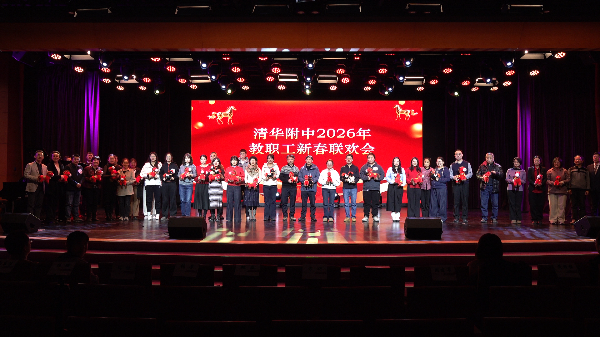 1月22日下午,清华附中清晏楼报告厅张灯结彩、暖意融融,2026年教职工新春联欢会顺利举行。校长方妍、党委书记曹海翔率党政班子成员与全校五百余名教职工欢聚一堂,共赏精彩演出,共话教育初心,共迎马年新春。