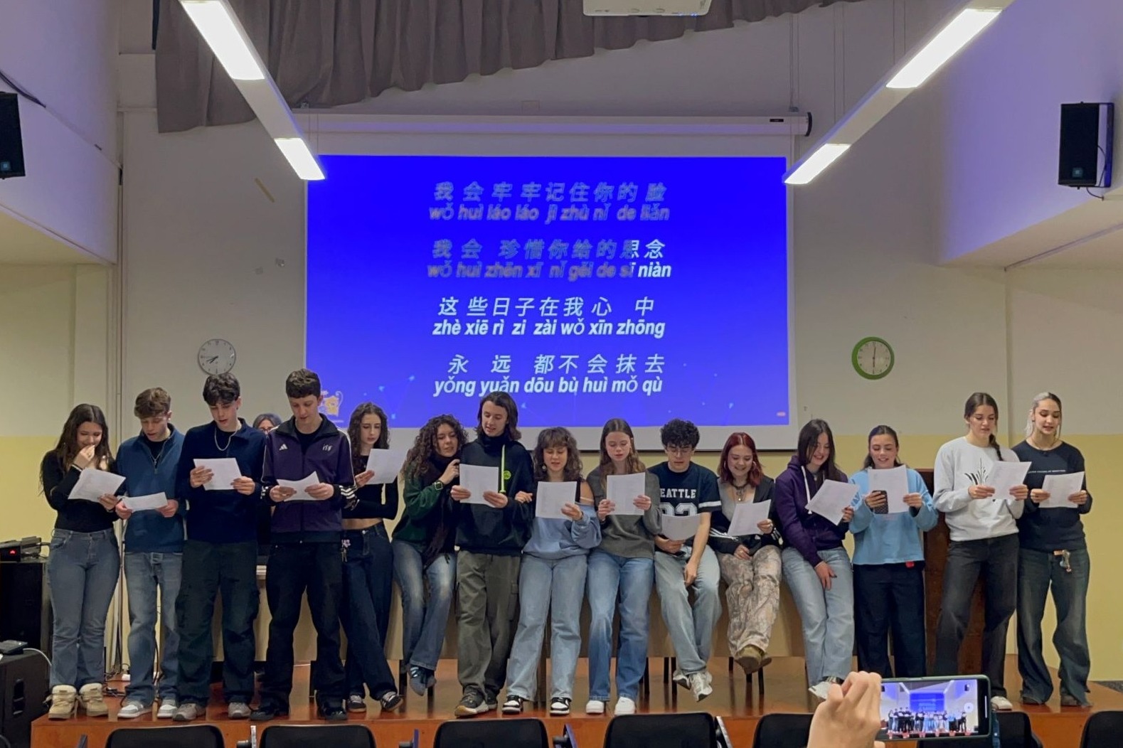 在课堂学习环节,两校学子亲切交流,积极互动。姊妹校同学们向清华附中同学们讲解日常实用意大利语,耐心、细致地讲解发音与用法,介绍了米兰的城市特色与文化风情。并在课堂中穿插趣味互动游戏,大家学习合唱意大利歌曲,气氛热烈融洽。