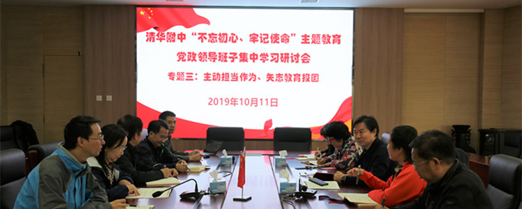 10月11日下午、12日上午清华附中召开“不忘初心、牢记使命”主题教育第三次专题集中学习,研讨“主动担当作为、矢志教育报国”专题。全体党政班子成员参加学习,党委书记方妍主持学习 。