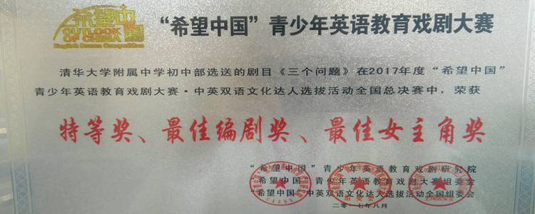 清华附中多个剧目在2017年度第八届“希望中国”青少年英语教育戏剧大赛中斩获佳绩。其中,由赵琼、李冰清老师指导的剧目《三个问题》荣获全国总决赛特等奖、最佳编剧奖、最佳女主角奖;由周维纬、范皖晴老师指导的剧目《项链》荣获全国总决赛一等奖、最佳女主角奖;由蒋中蓝老师指导的剧目《格列佛游记新传》荣获全国总决赛一等奖;由刘辉、郅明刚老师指导的剧目《罗密欧与朱丽叶》荣获全国总决赛二等奖。