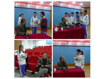 讲座前,同学们拿出王老师的作品请他签名留念 王晋康老师在做讲座