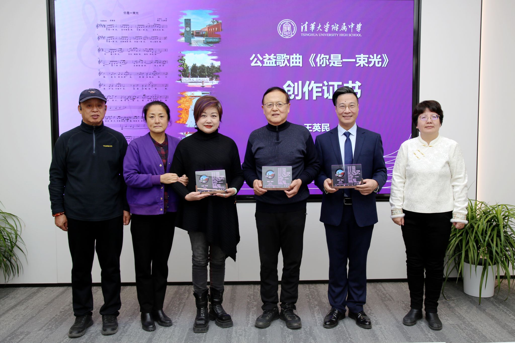 会前举行了公益歌曲《你是一束光》创作团队座谈会暨创作证书颁发仪式。该歌曲由清华附中教师团队为“成志英才培养计划”公益项目自主创作,旨在以艺术形式传递教育温暖、凝聚帮扶力量,象征附中人对教育帮扶事业的深厚情怀与责任担当。方妍校长为王英民、鞠红、王金峰三位老师颁发《你是一束光》作词、作曲证书及纪念品,并对创作团队的付出表示衷心感谢。