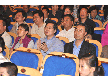 清华附中校长王殿军在观众席观看演出 附中乐团办公室主任胡军为附小演出奉上庆贺花篮