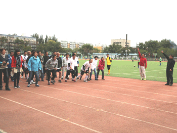 解巨钊副校长(右1)为百年校庆百米接力启动仪式鸣发令枪 解巨钊副校长(居中)与全体队员合影留念 1