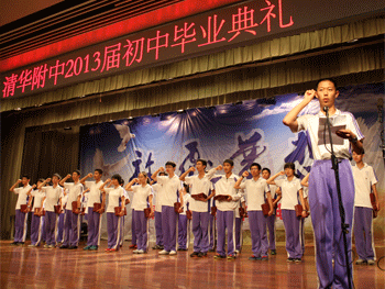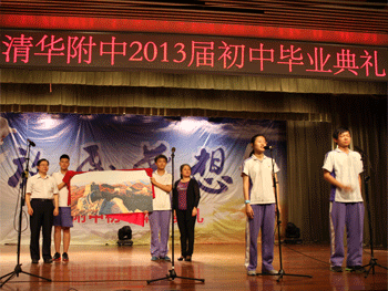 6月20日下午,清华附中举行2013届初中毕业典礼。校长王殿军,党委书记方妍,副校长杜毓贞、解巨钊、赵鸿雁、副书记张洁,德育处副主任郎艳、初三年级组长张苏、张颖以及初三全体师生出席了典礼。教务主任朱培主持典礼。