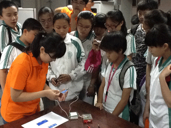 同学们首先来到中科院理化所,听取了工作人员对理化所的简单介绍以及有关胶原蛋白的知识。然后,同学们在志愿者的带领下观看了许多高科技产品的演示,如“太阳能制氢”、“污水处理演示”等。