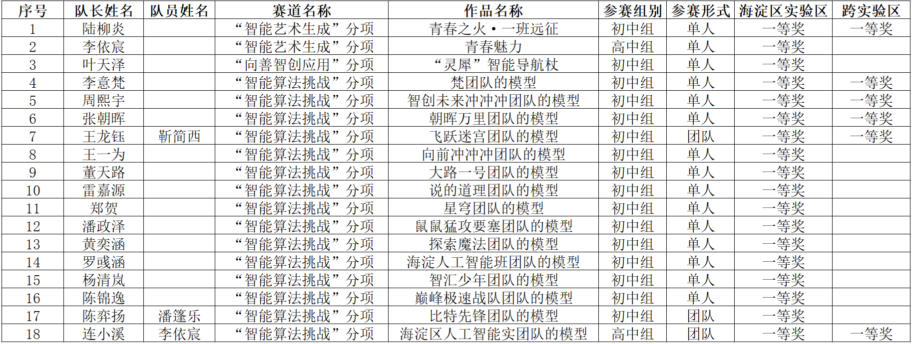 12月28日,首届海淀区中小学“智能未来”邀请赛在北京交通大学附属中学北校区圆满落幕。本届赛事以“智启梦想,科技向善”为主题,紧密围绕青少年人工智能素养发展,设置了智能艺术生成、向善智创应用、智能算法挑战三大赛项。清华大学附属中学及海淀区人工智能实验班的学生们在比赛中表现突出,共计获得18项实验区一等奖,其中有6项荣获跨实验区一等奖,涵盖1项智能艺术生成与5项智能算法挑战赛道。