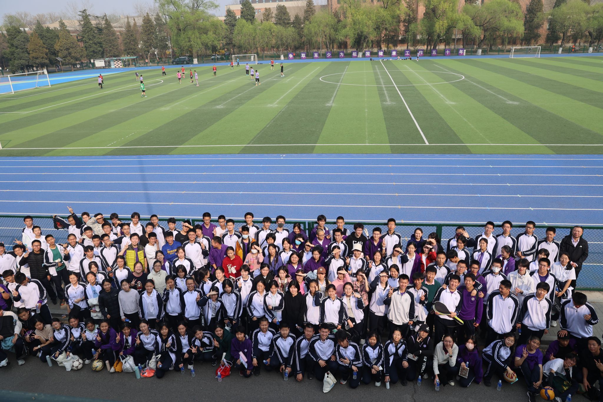 奥林匹克森林公园内,高一2班、6班、7班、10班、18班和19班的师生开展了形式多样的踏春活动。其中,18班与19班联合举办“1819一起走”奥森迷你马拉松,以“青春健身、班级凝聚”为主题,开展约5公里的徒步与慢跑活动,全程不竞速、不排名,鼓励同学们结伴而行、互帮互助,沿途设置的打卡点与趣味小任务,让大家在自然美景中舒展身心、磨炼意志,增进两班情谊。