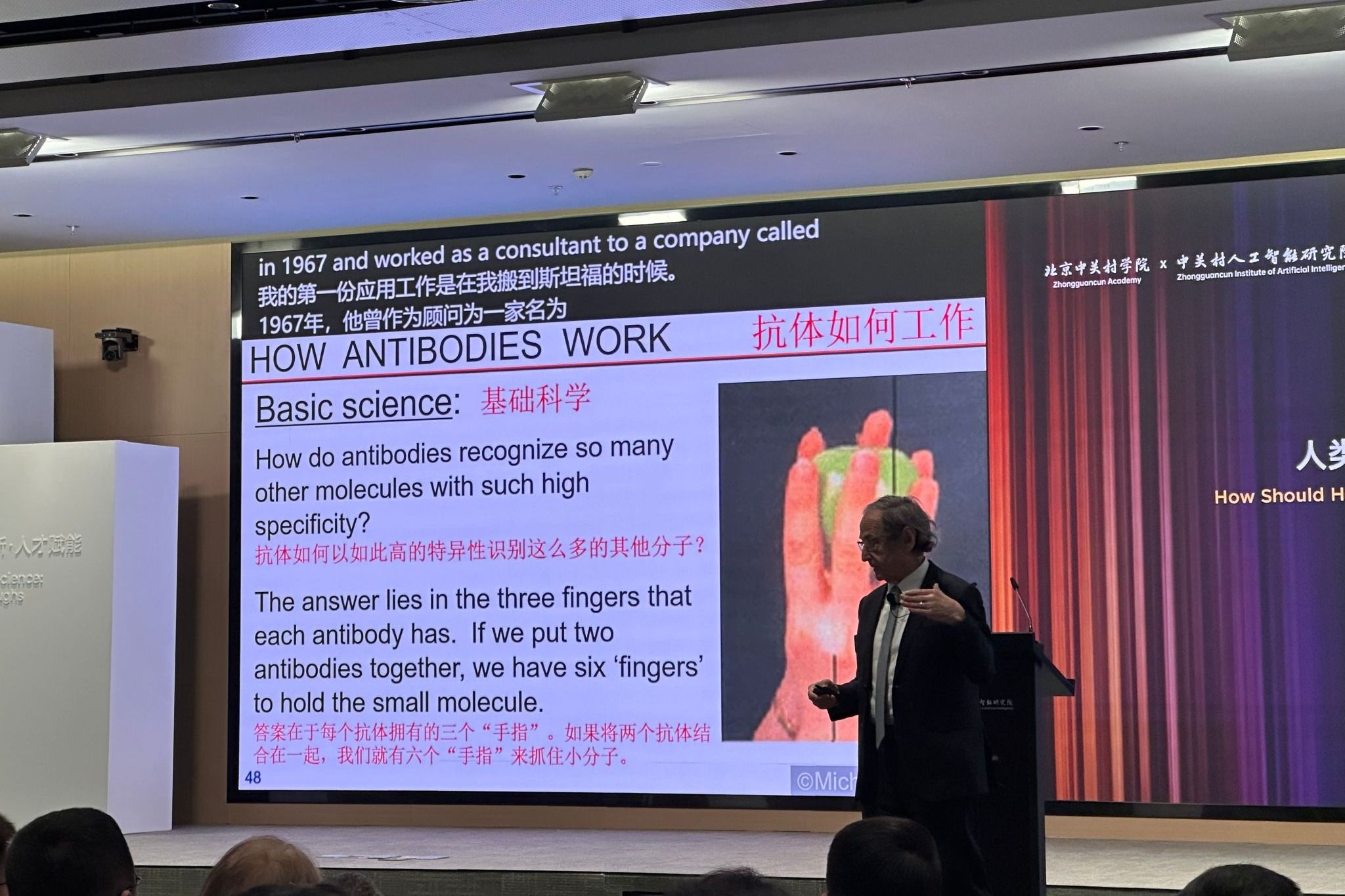 迈克尔·莱维特在报告中回顾了自己将计算机引入交叉学科研究的经历。他因“开发复杂化学系统的多尺度模型”获2013年诺贝尔化学奖,并分享了自己使用人工智能开展研究的心得。他通过“抗体如何识别分子”“蛋白质折叠”等研究案例展示了人工智能如何推动基础科学的变革。他特别鼓励学生,真正重要的是保持好奇、敢于提问,并坚持自己真正感兴趣的问题。
