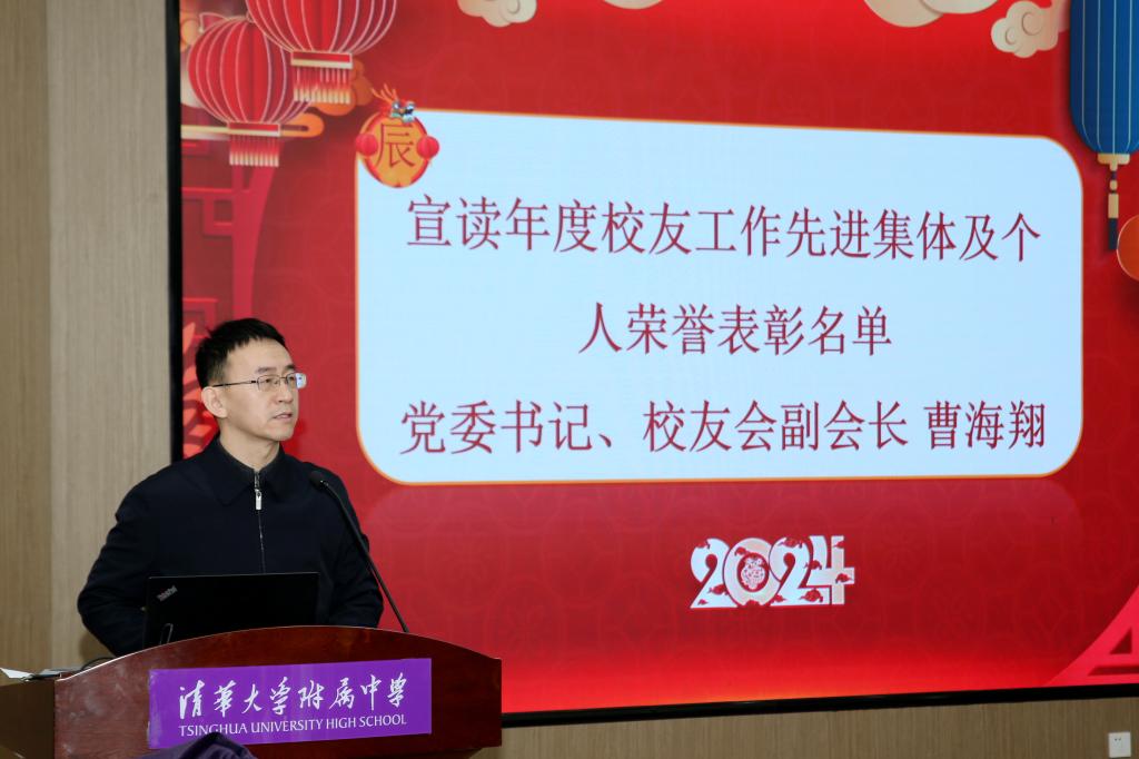 清华附中党委书记、校友会副会长曹海翔宣读年度校友工作先进集体及个人荣誉表彰名单。随后,学校领导班子为校友颁发了聘书及各类荣誉证书。