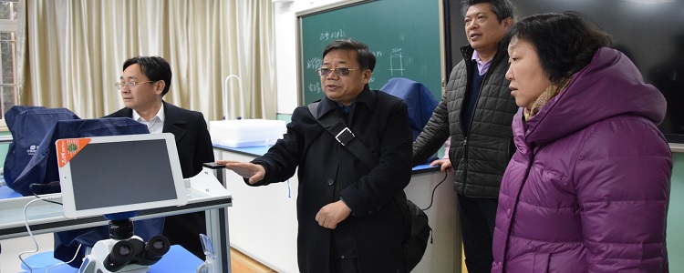 在朱建宏校长和程惠云副校长的带领下,解巨钊副校长一行深入操场、实验楼、教学楼、图书馆、食堂、宿舍等进行了实地查看。朱建宏校长向指导团各位领导和老师详细介绍了将台路校区的各种硬件设施。解巨钊副校长对校园安全设施情况、后勤服务现状、设备使用等进行了细致了解和工作指导。