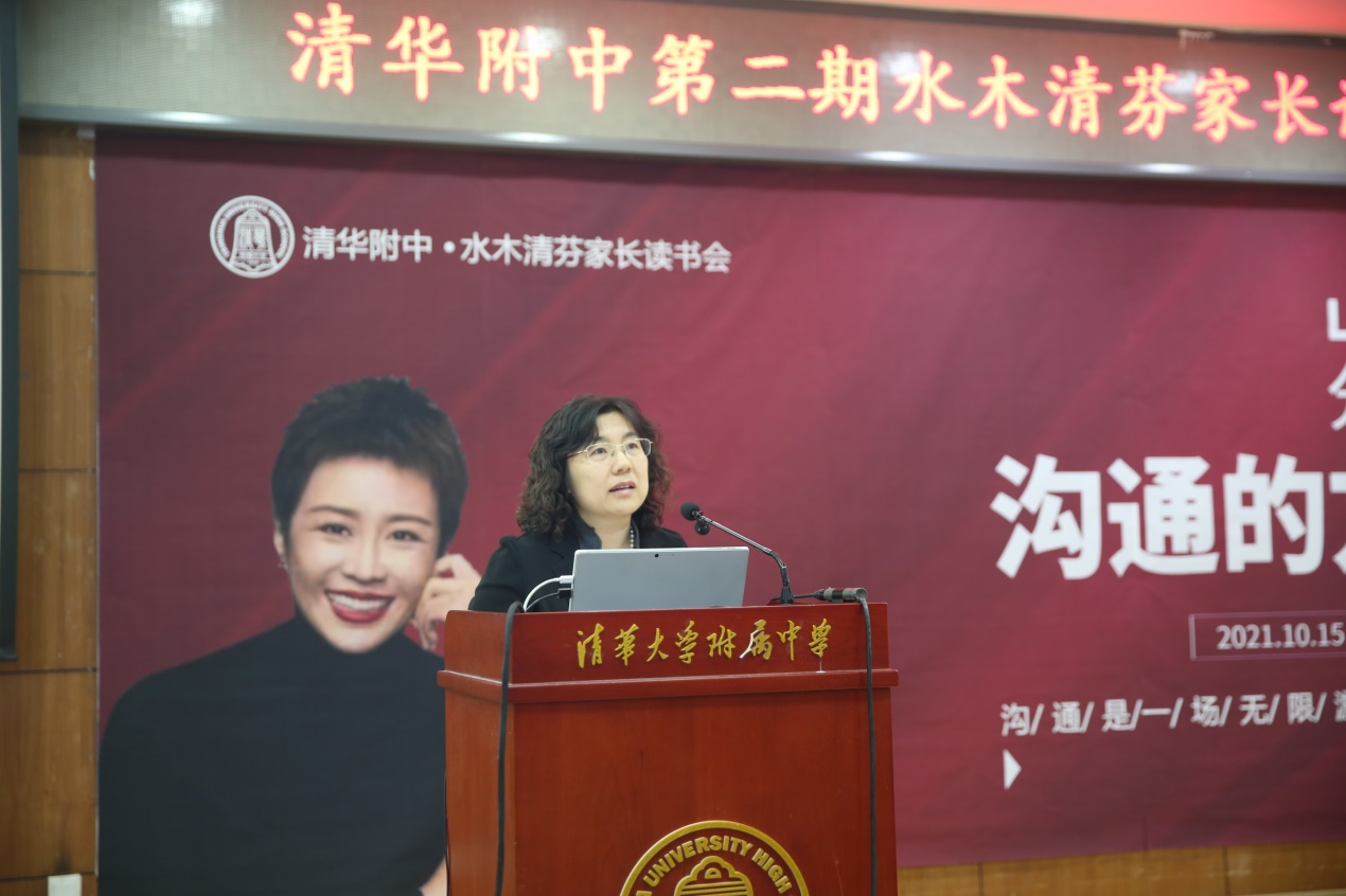 2021年10月15日,清华附中校家委会"水木清芬家长读书会"第二期在华茂楼106会议室正式开讲。本期线下读书会特邀请《沟通的方法》作者——“得到”联合创始人兼CEO脱不花女士,进行分享交流。清华附中副校长白雪峰、学生发展中心主任李书霞、家委会核心组织者、附中部分教师以及附中学生家长共300余人参与此次分享会。家委会会长初20级李恩杨妈妈主持了这次活动。