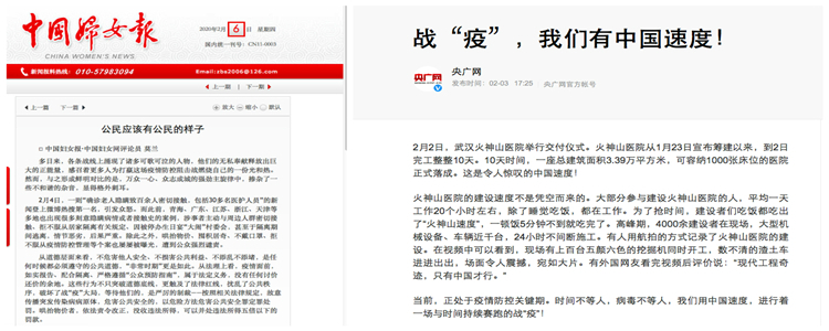 “在这场没有硝烟的战“疫”中,我们用中国速度为世界防疫争取宝贵时间,用中国力量筑牢控制疫情蔓延的防线,用中国实践为世界防疫树立了新的标杆。”