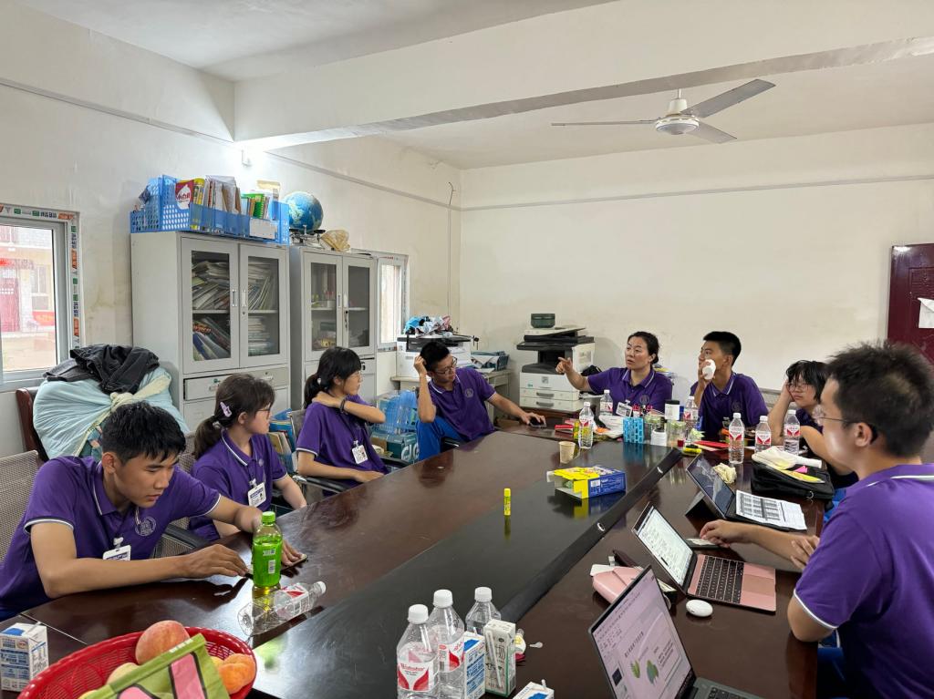 由于持续的暴雨,很多当地学子因家门口的积水无法到校,于是在支教团的集体策划下,快速启动应急方案,开展了为期一天的“水木行动”——清扫教室、整理座椅、美化墙壁。结合教室内已有的班级文化,霍滢霏同学设计了三款墙壁:竹林熊猫、海洋蛟龙和太空遨游。一想到孩子们未来可以在自己布置的教室中学习和生活,支教的“小老师们”干劲十足。晚饭后,“小老师们”积极准备教具,认真备课,为第二天的课程做准备。