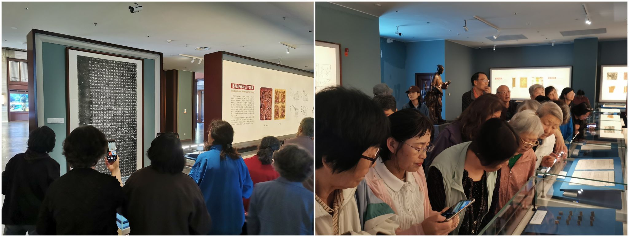 在“斯文在兹”主题展,离退休教师们认真欣赏《西楼苏帖》;在“版本琳琅”主题展,离退休教师们认真观赏不同年代的古籍善本