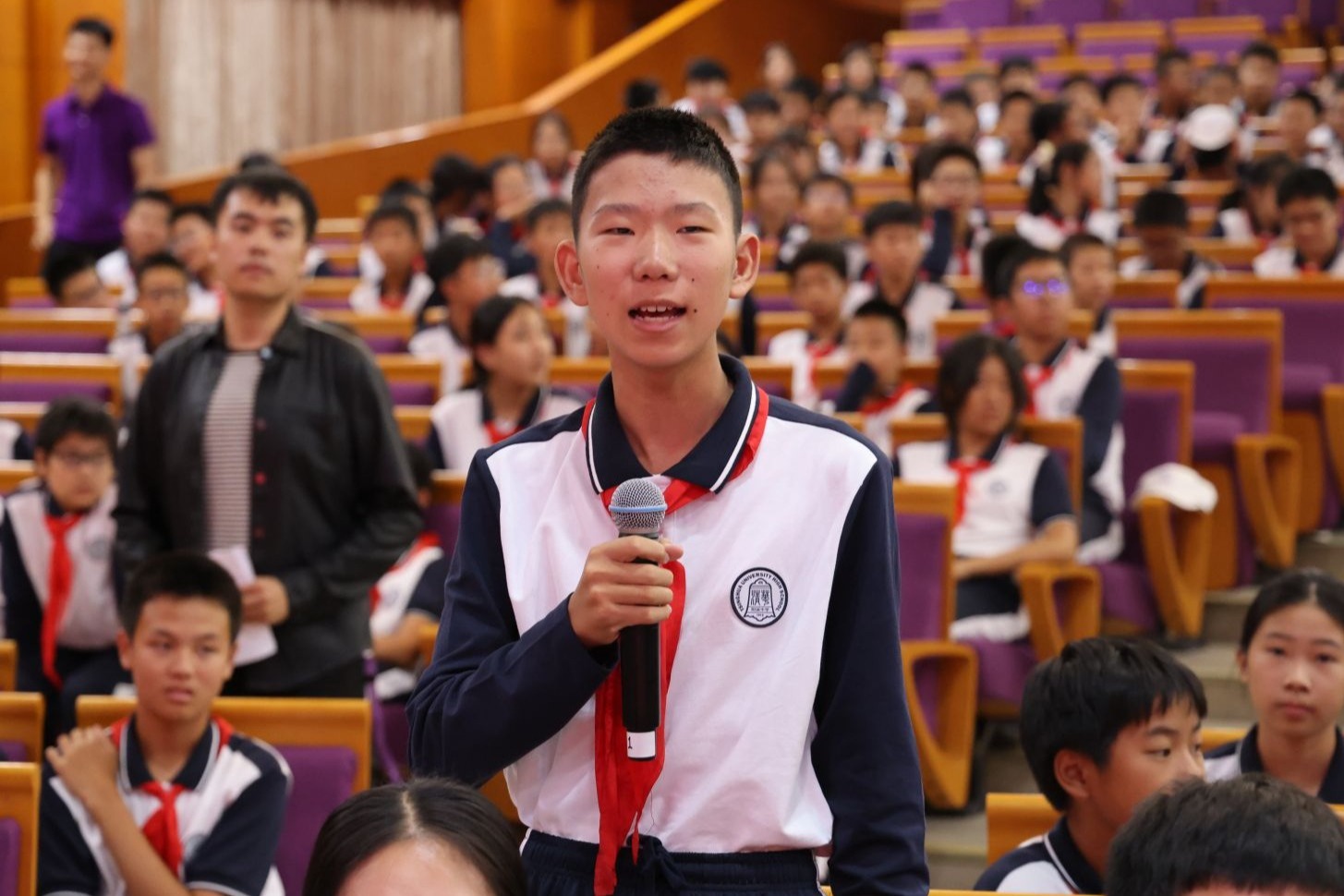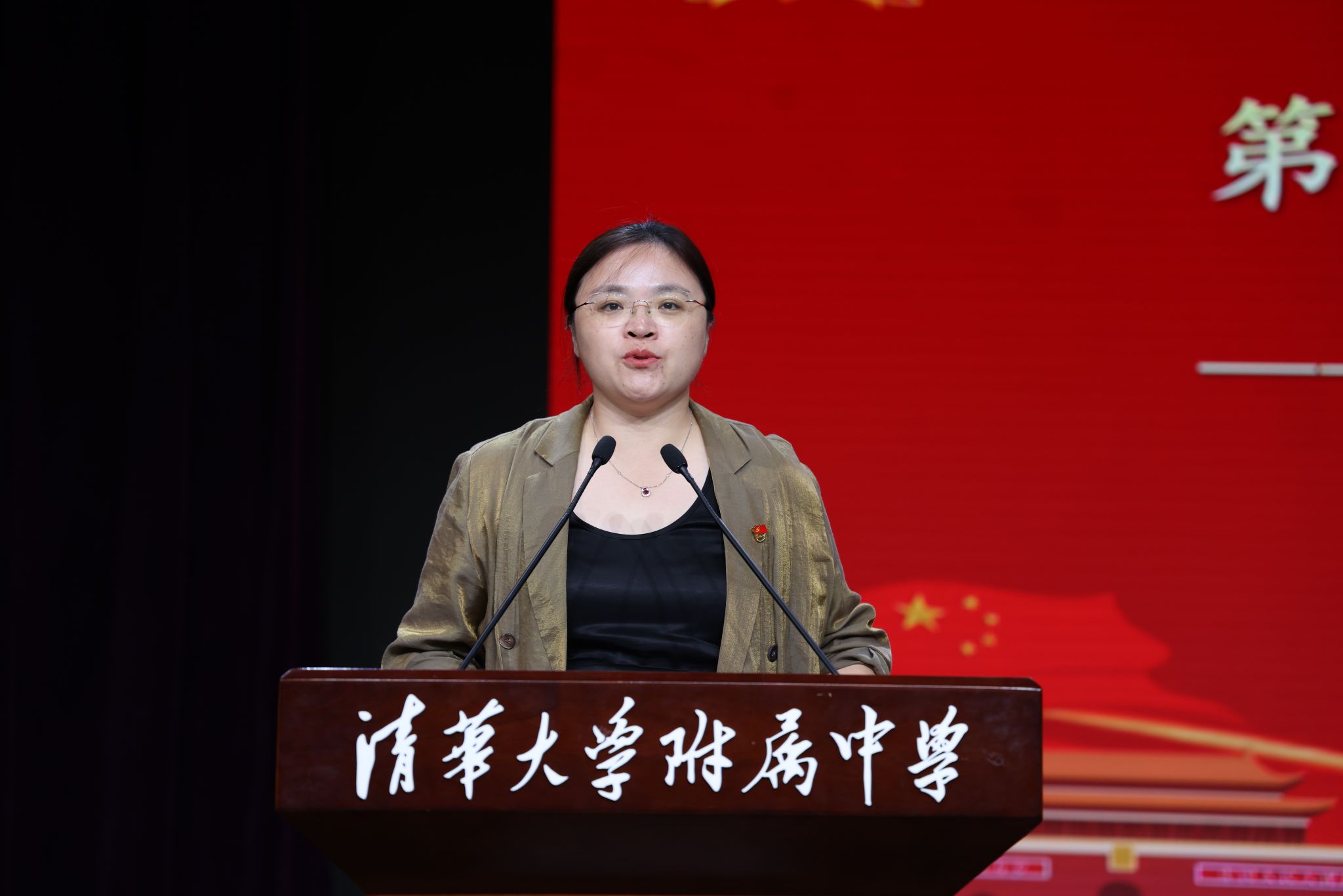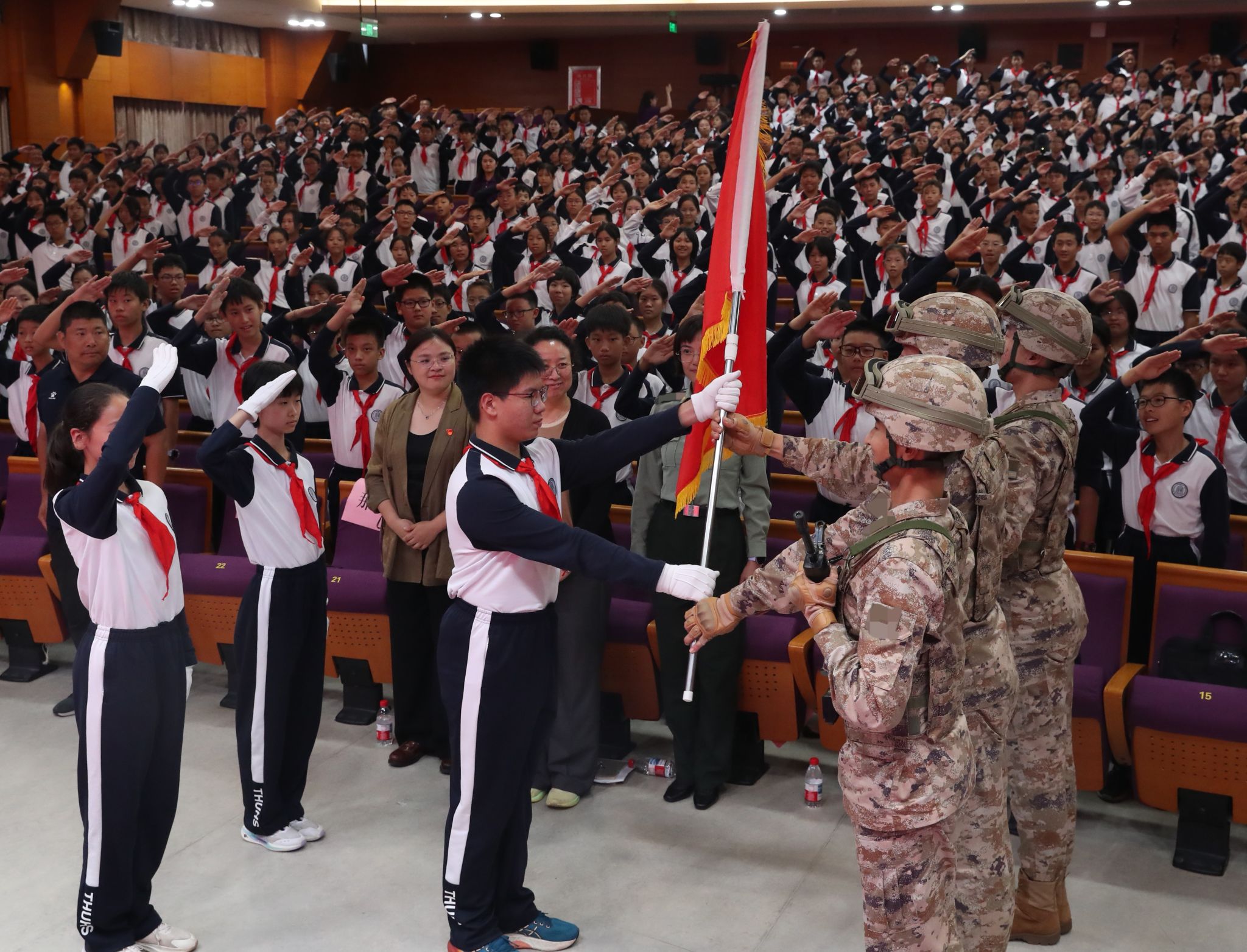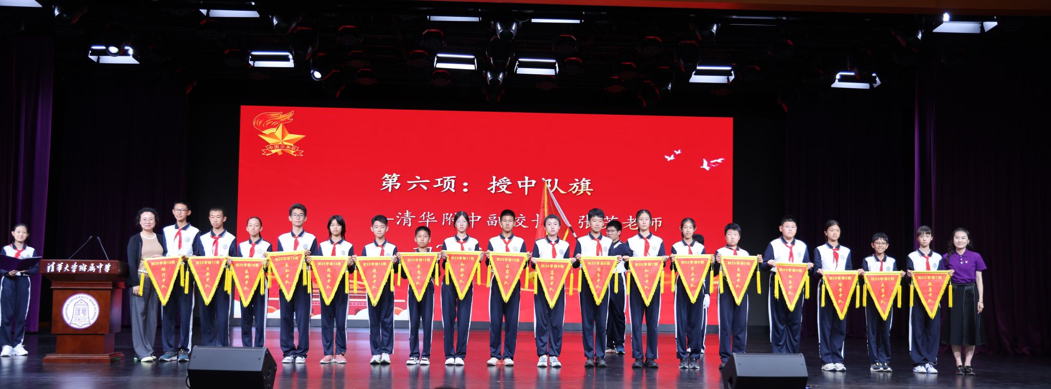 仪式上,学生发展中心副主任李冰清宣读初25学部建队决定。在热烈的掌声中,清华附中副校长张苏与初25学部主任那妮老师为各中队授中队旗,接过队旗的中队长们昂首挺立,肩负起引领中队成长的责任。初2516班胡钊翔作为少先队员代表上台发言,他分享了对加入少先队的憧憬与期待,表达了传承国防精神、勇担少年使命的坚定信念。