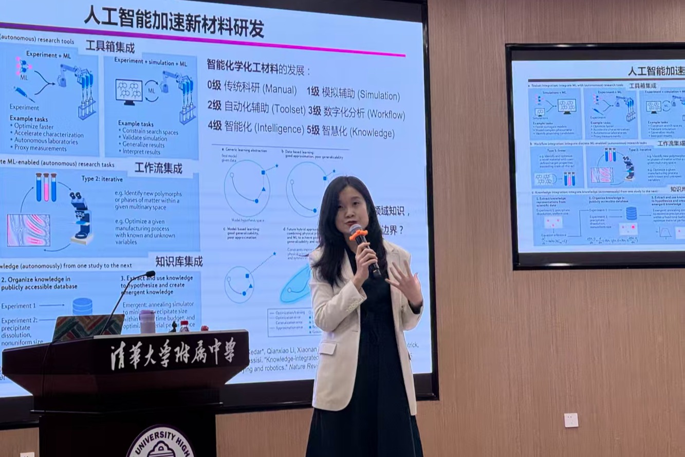 王笑楠老师以自身成长经历开场,从山西临汾一中的学子到清华大学、欧美顶尖学府的科研工作者,再到回归清华投身“人工智能+化工”前沿领域,她用亲身经历告诉同学们:“科学没有边界,成长充满可能。”她鼓励学生从“做题家”转变为“出题家”,勇于提出真问题、探索未知领域。
