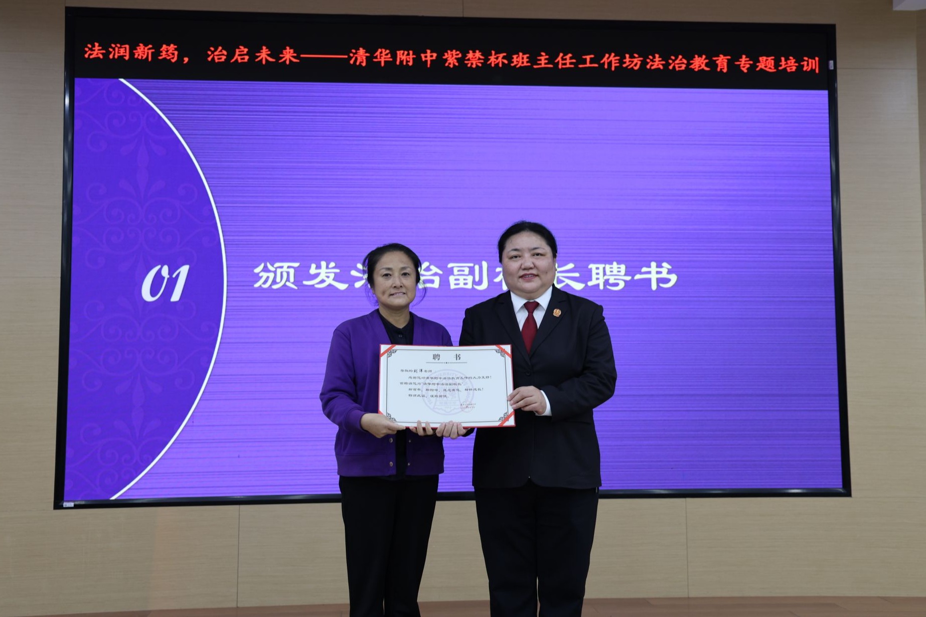 培训伊始,现场举行了法治副校长聘书颁发仪式。方妍校长为刘洋法官颁发聘书,这一举措为推动学校法治教育常态化和专业化开展筑牢基础,也将学校法治教育推向新的发展阶段和更高维度。