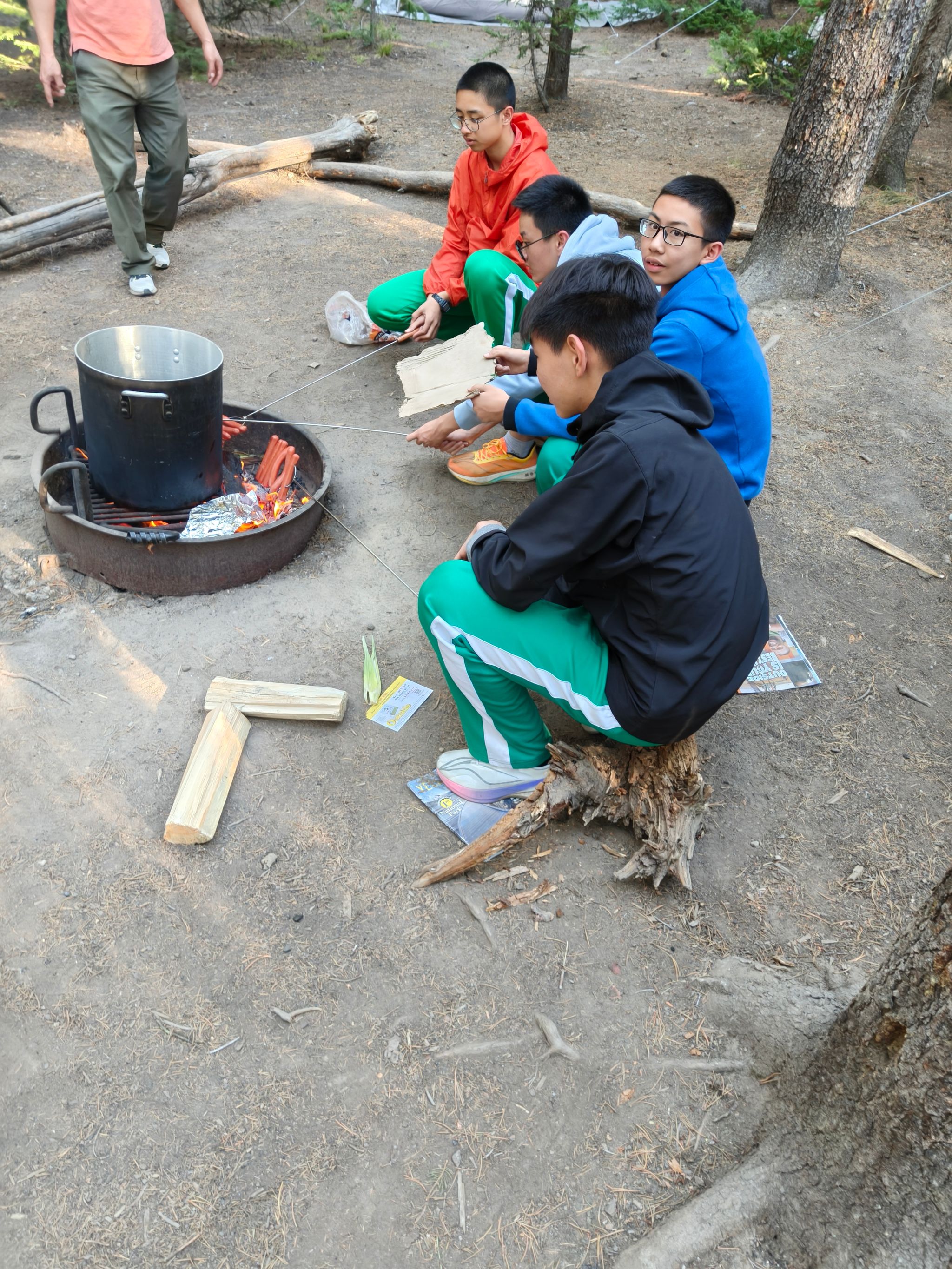 分小组生火、烧水、烤肠