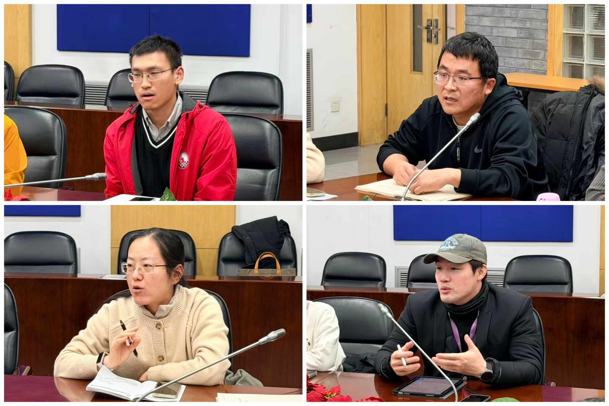 物理实验员赵晨光(左上),生物实验员赵星行(左下)、房鹏(右下),化学实验员张春旺(右上)发言