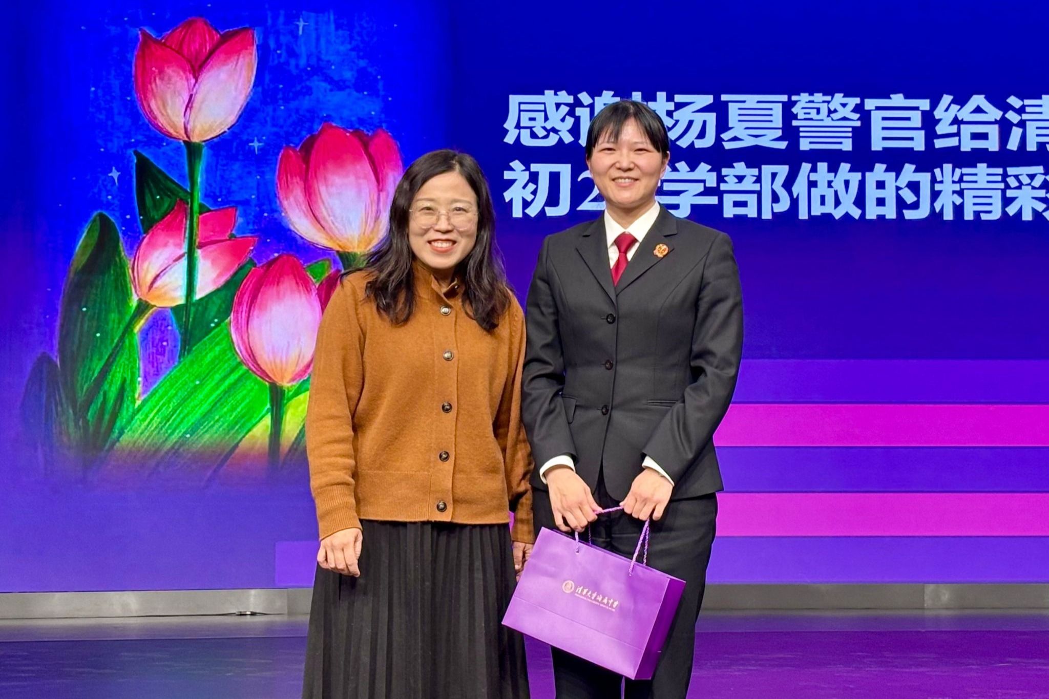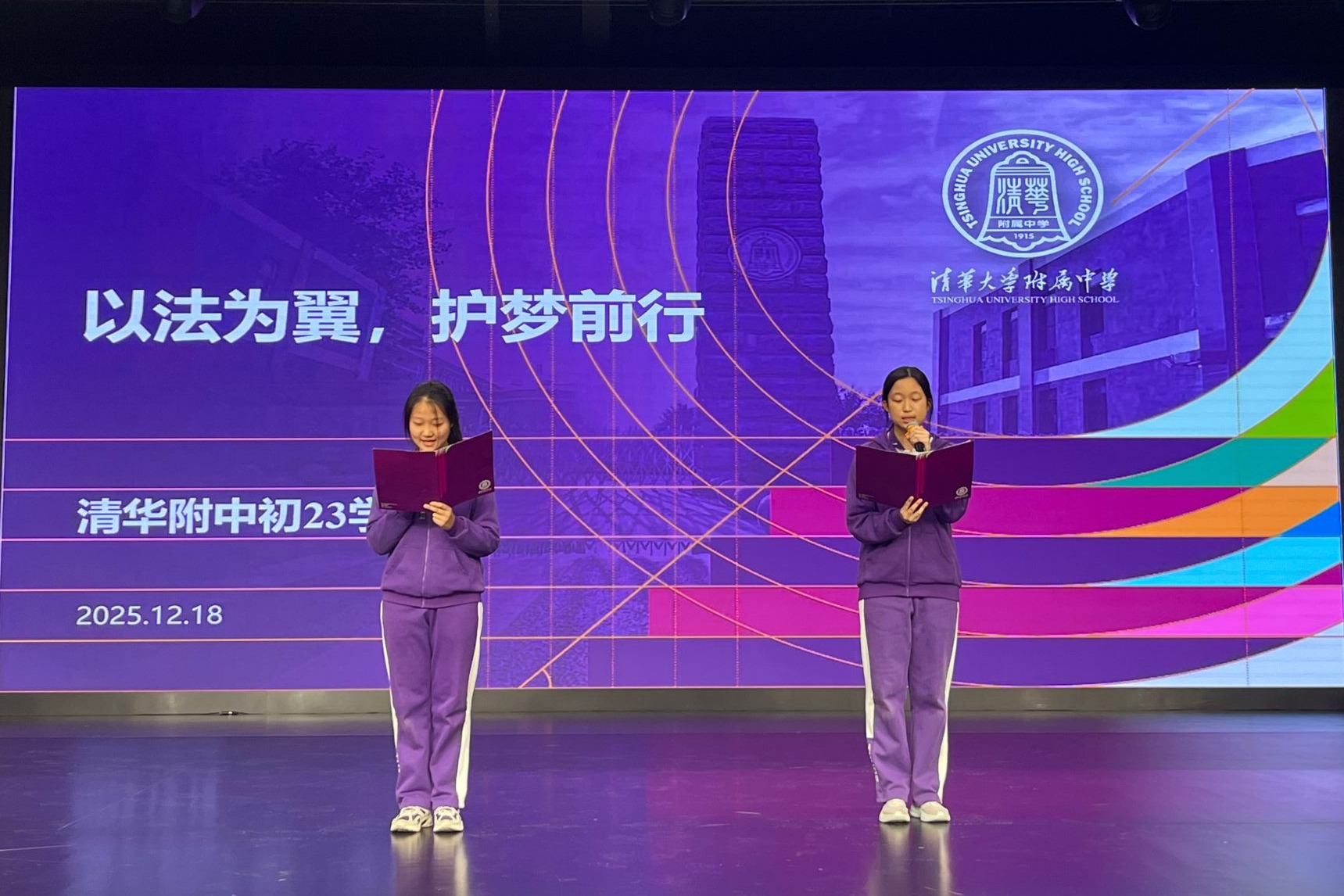 为深入贯彻国家宪法日精神,筑牢青少年法治思想根基,引导初三学子树立规则意识与自我保护能力,12月18日,清华附中初23学部举办“以法为翼,护梦前行”法治教育主题学部会。活动邀请北京市第三中级人民法院未成年人案件综合审判庭副庭长杨夏法官主讲,清华附中副校长张苏、学生发展中心副主任李冰清、初23学部家委代表李雨宸妈妈、心理教师周灿灿、初23学部主任张晓琼、副主任周小玲、助理李亚珂与全体初三班主任和学生共同参与,以专业讲座、校园短片、心理疏导等多元形式,打造了一场沉浸式法治教育盛宴。活动由初三13班赵姝媛和初三17班王炫然主持。
