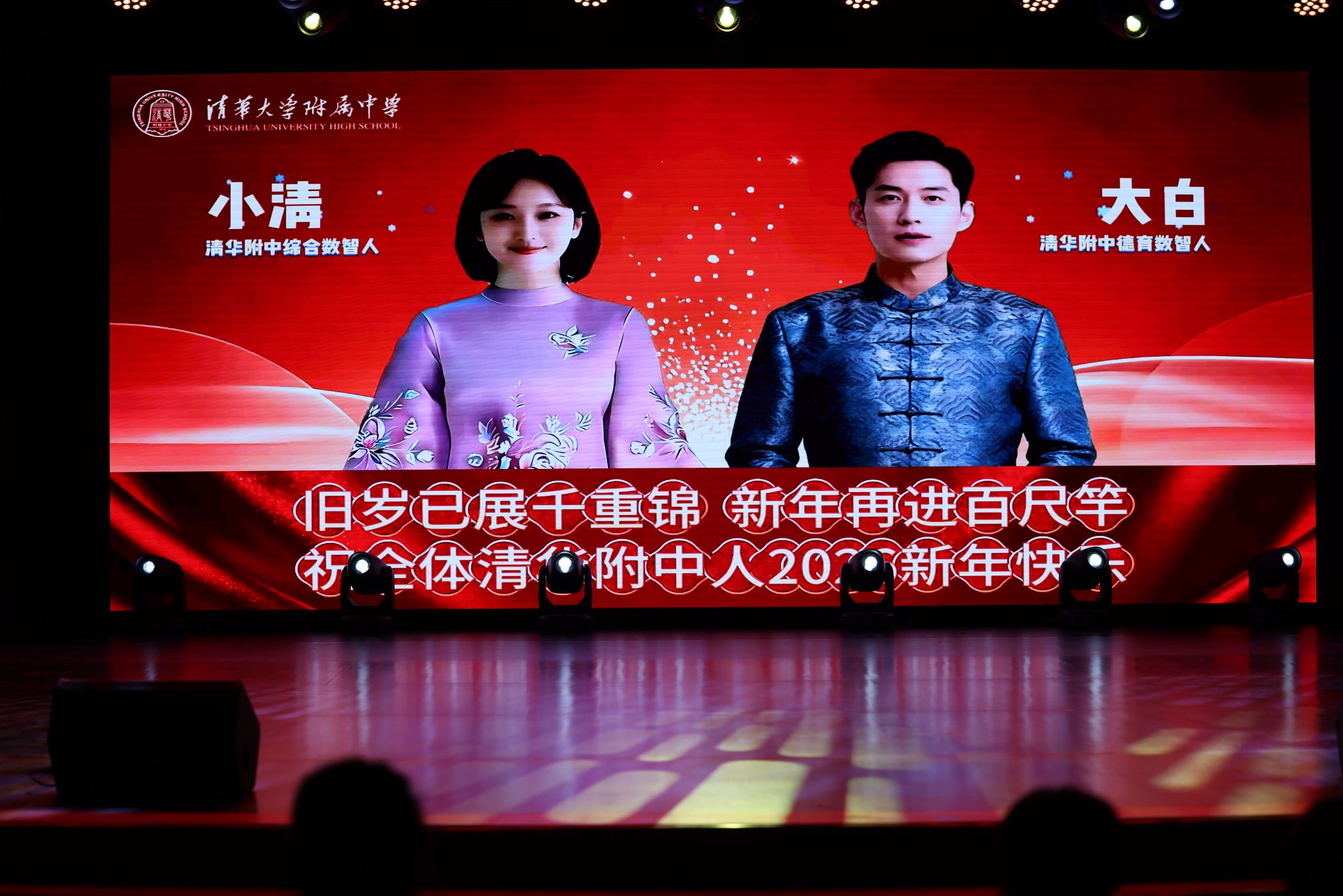更具科技感的是,清华附中数智人“小清”和“大白”通过大屏幕俏皮亮相,用生动有趣的语言送上专属新春问候,为传统佳节增添了别样的时代气息,引得现场掌声阵阵。