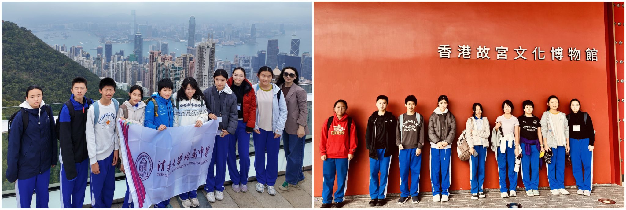 清华附中师生在太平山顶、香港故宫博物馆门口合影