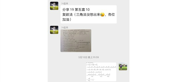 为保证数学基础较好的同学原有的学习进度,周老师和李劲松老师准备了难度稍大的数学提高讲义,每周一讲,精选习题,鼓励学生之间互相讨论,互相分享好的解题方法。每周周俊老师会将同学们有疑问的题目,写下详细的解答过程,拍照片发到班级微信群中。虽然他和学生不能见面,但是学习数学的心始终是连在一起的。