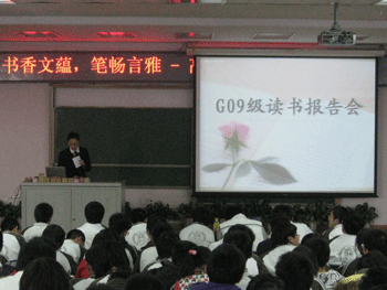 每班推选一位同学做了精彩的读书报告。分别是高0902班王泓宇的《话说红楼梦》;高0910班司小萌的《我的,读书》;高0908班魏庭芳的《北大批判》;高0905班孙熙的《三国志读后感》;高0907班宁静的《灿烂千阳》;高0906班杨婉玥的《文学四味谈》;高0904班赵晨的《关于张爱玲,悲惨世界的感受》;高0901班王乐昕的《巴金的家》;高0903班陈宇亭的《关于简 奥斯汀》。语文组谢玄老师在最后作了精彩点评,并且讲述了读书的重要性和读书的选择的问题。