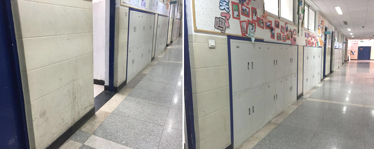 清理前的楼道墙壁(左)、清理后的楼道(右)