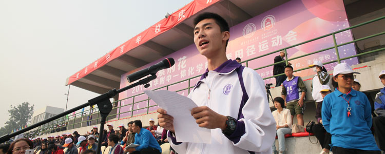 清华附中校长王殿军致开幕辞,他讲到体育的魅力在于点燃激情、放飞青春;挑战极限、永不放弃;公平竞争,友谊第一;强健体魄,为国拼搏。今天的运动会是对近代中国体育运动和体育教育的开拓者和奠基人马约翰先生的纪念(马约翰先生曾担任清华附中前身成志学校校长),是对他倡导的体育精神的弘扬,更是对“质朴、忠诚、勇毅、坚强”附中文化的传承!呼吁全体师生借这次一体化运动会的契机,共享母校百年的荣光与辉煌,追寻属于清华附中人的精神与文化,共同担当起历史和时代赋予我们的责任!