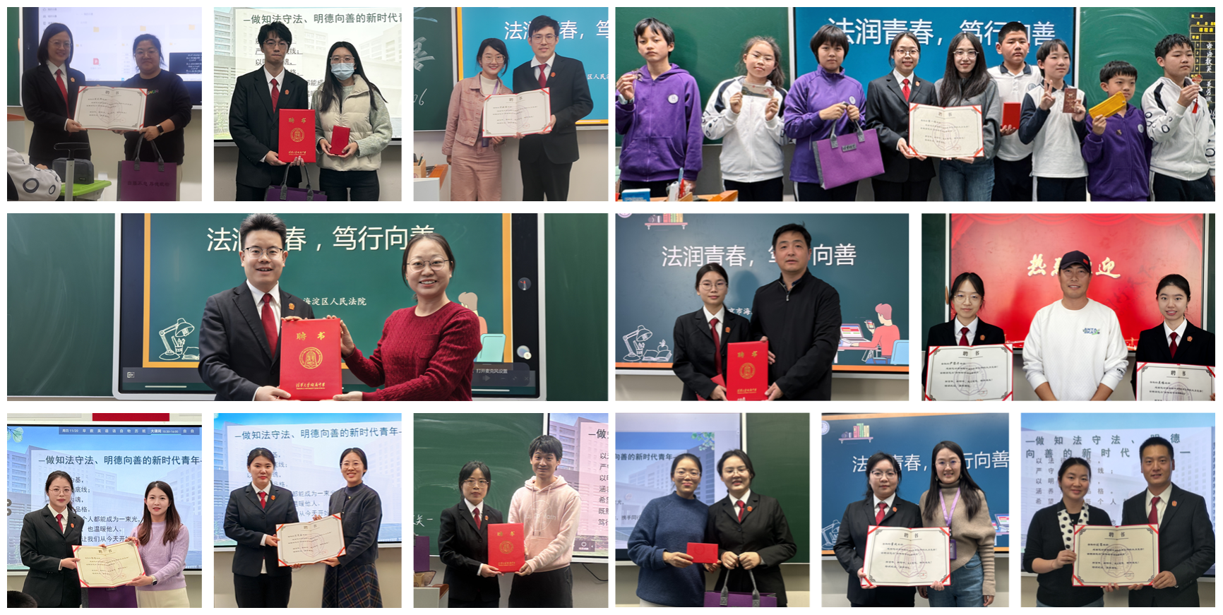 在班委的主持下,初一学部各班班主任代表班级,向参与授课的法官们郑重颁发“法治辅导员”的聘书。聘书承载着家校社协同育人的深厚期许,标志着每位法官正式成为班级法治教育的专属指导者,将为学生日常法律困惑解答、法治实践活动开展提供持续且精准的支持,让法治护航延伸至校园生活的每一个角落。