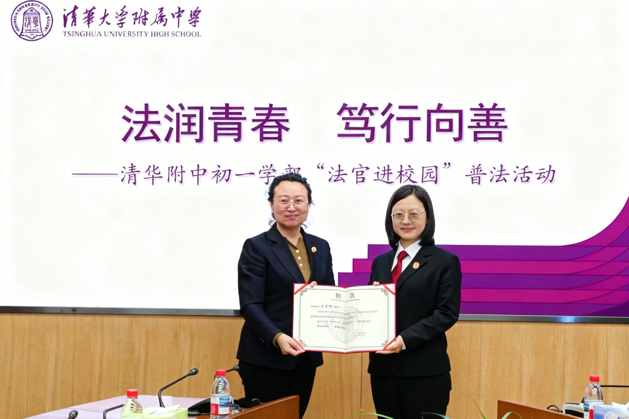 恰逢“国家宪法日”来临之际,为深入落实《中华人民共和国法治宣传教育法》(2025年11月1日起施行)要求,精准对接初中生成长需求,筑牢青少年法治观念根基,11月20日,清华附中初一学部联合海淀区人民法院成功举办“法润青春•笃行向善”的主题普法活动。海淀区人民法院政治部副主任周元卿带领18名法官一行走进清华附中校园,通过深度研讨定制方案、法官进班精准授课、法治感悟沉淀内化三大环节,让宪法精神与法律知识融入青春成长,引导学生树立“知法、懂法、守法、用法”的意识,涵养向善品格,打造法治教育与校法联动的示范样板。