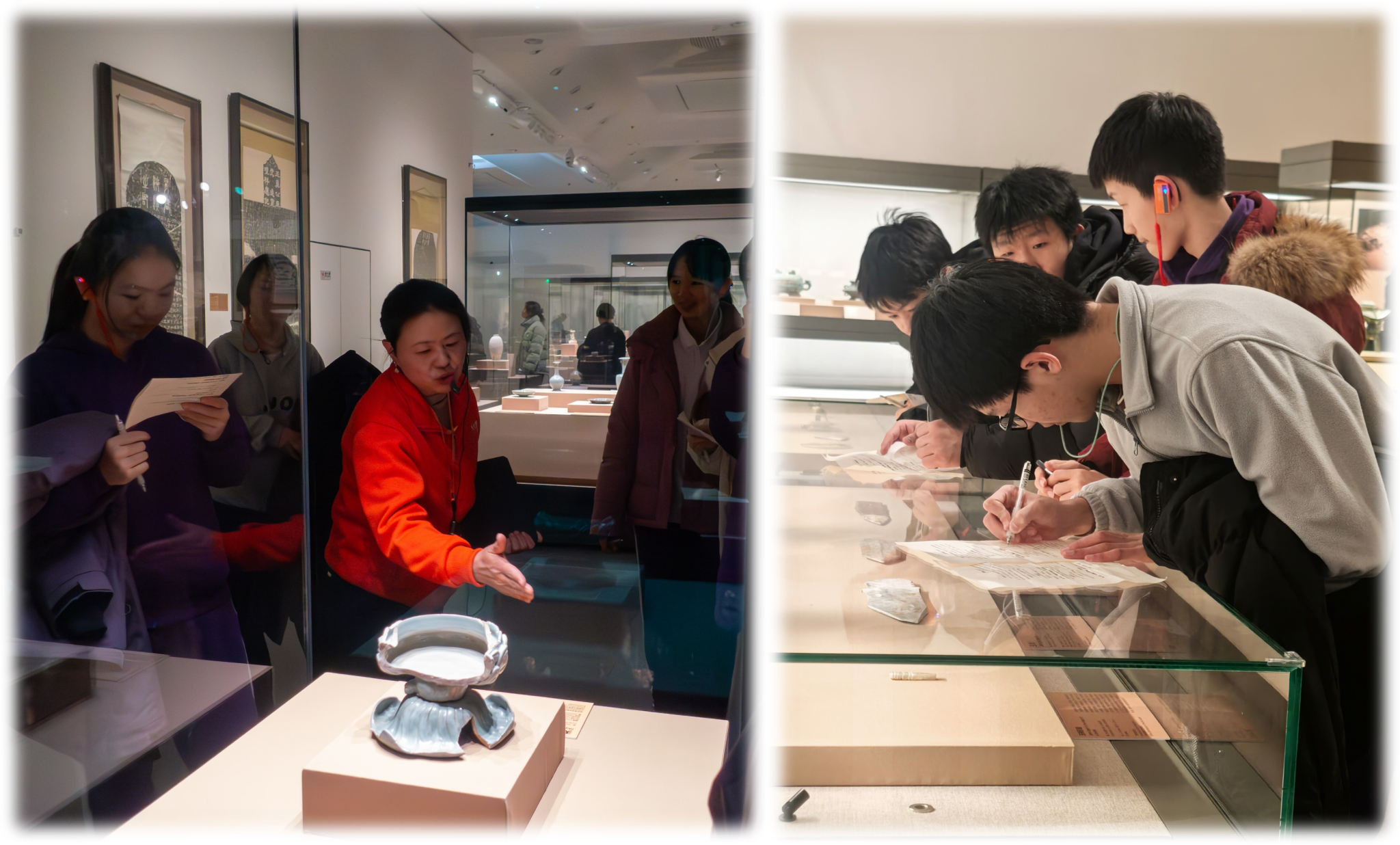 讲解员为同学们介绍文物细节(左)同学们认真观察、思考和记录(右)