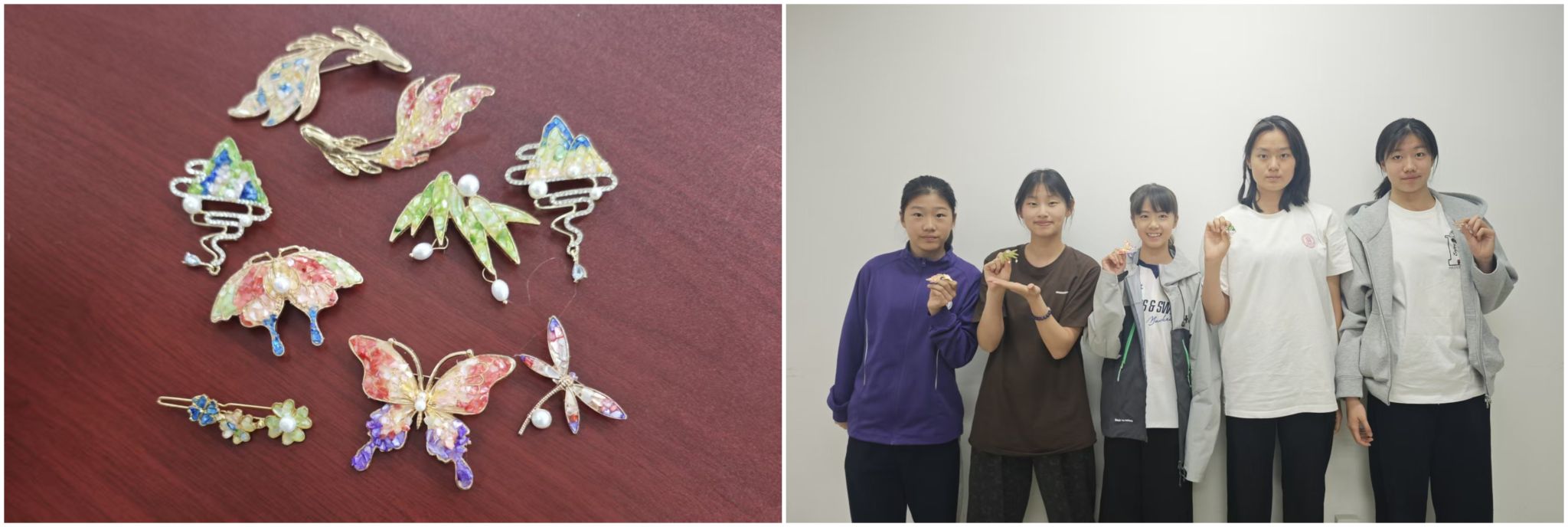 实操环节,同学们以制作螺钿胸针为目标开启创作之旅。在韩老师的指导下,大家根据自己的喜好挑选螺钿片,精心搭配色彩与造型,专注地进行粘贴、镶嵌与打磨。同学们的指尖在螺钿片与胸针胚体间灵活游走,原本平淡的金属胚子,在螺钿特有的温润光泽映衬下,逐渐蜕变成栩栩如生的蝴蝶、雅致精巧的花卉等精美胸针作品。每一件成品都凝聚着同学们的巧思与匠心,闪耀着传统工艺的独特光彩。