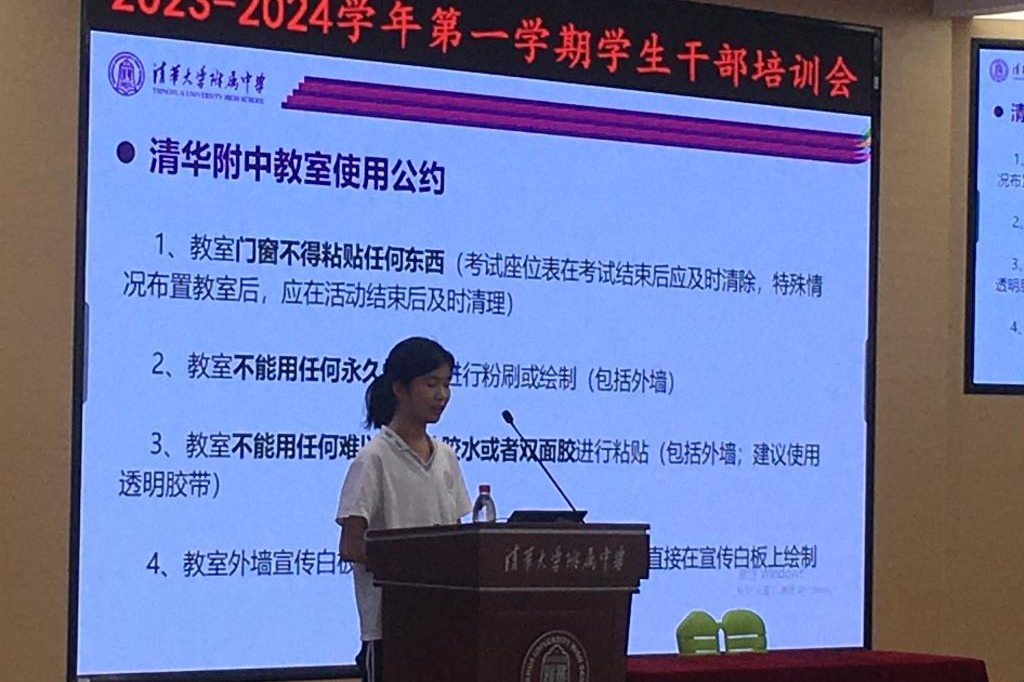 最后,团委书记于洺老师以“当好学生干部:为什么,怎么做”为题,介绍了清华附中的德育理念和育人目标,提出了对附中学生干部新的要求和期待,希望学生干部们能够“坚定理想信念,练就过硬本领,锐意进取、改革创新”。